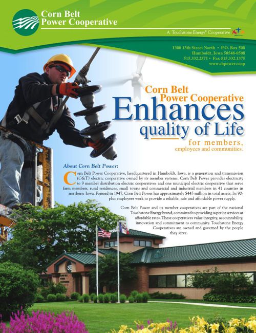 Corn Belt Power Cooperative is a generation and transmission electric cooperative in northern Iowa. Corn Belt provides electric service to nine 9 member rural electric cooperatives all of which are public utilities and to one 1 municipal electric cooperative association all of whose members are municipal public utilities. Americas largest utility network Touchstone Energy is an alliance of local consumer-owned electric cooperatives.